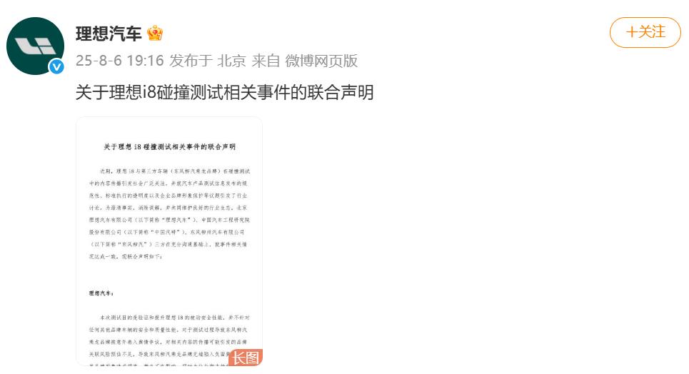 8月6日晚间,据理想汽车官方微博,理想汽车、中国汽研、东风柳汽发布联合声明。