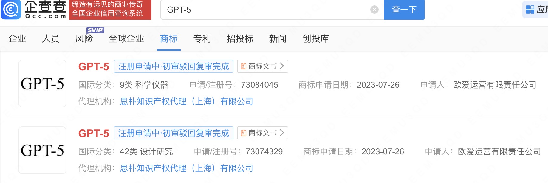 企查查APP显示,欧爱公司(OPENAI, INC.)已申请注册两枚“OPENAI GPT-5”商标,国际分类为设计研究、科学仪器,上述商标流程均为商标无效·初审驳回。