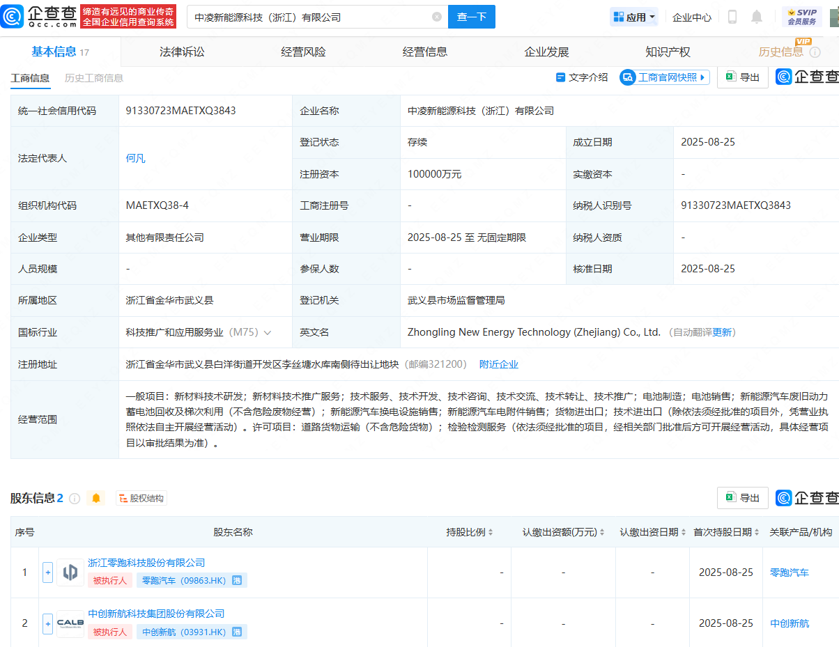 零跑汽车、中创新航成立新能源科技公司,注册资本10亿元