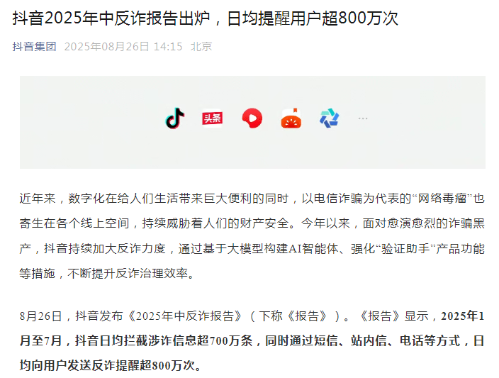 8月26日,抖音发布《2025年中反诈报告》(下称《报告》)。《报告》显示,2025年1月至7月,抖音日均拦截涉诈信息超700万条,同时通过短信、站内信、电话等方式,日均向用户发送反诈提醒超800万次。