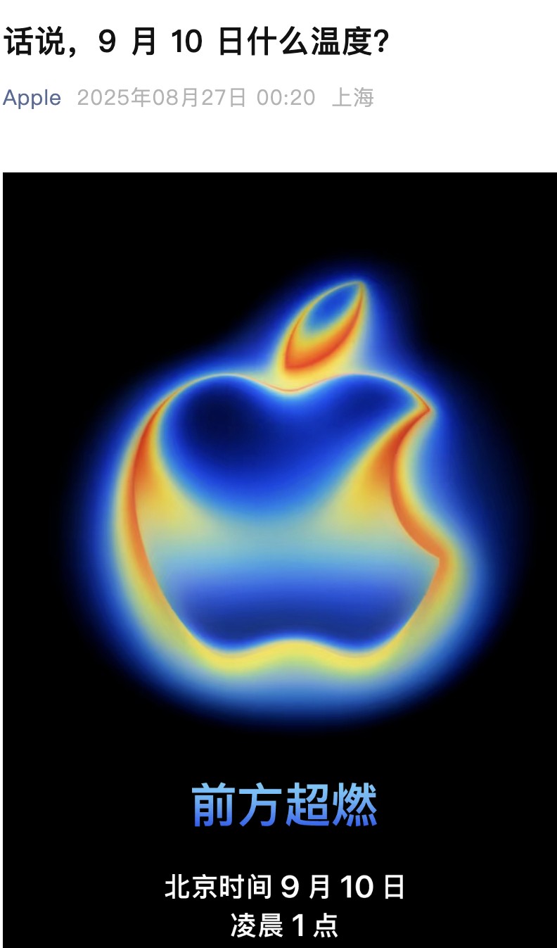 此次发布会主题为“前方超燃”,苹果以火焰元素重构LOGO,传递新品亮点。根据相关信息,本次发布会除iPhone 17外,还将有多条产品线新品登场。