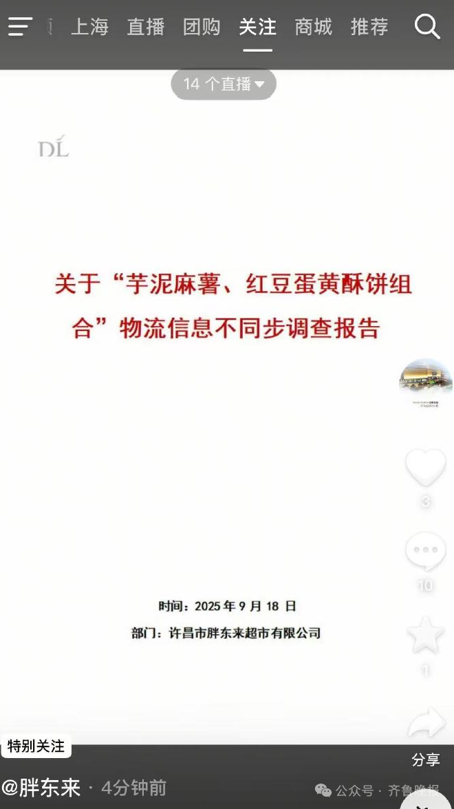 9月18日,胖东来发布关于“芋泥麻薯、红豆蛋黄酥饼组合”物流信息不同步调查报告。
