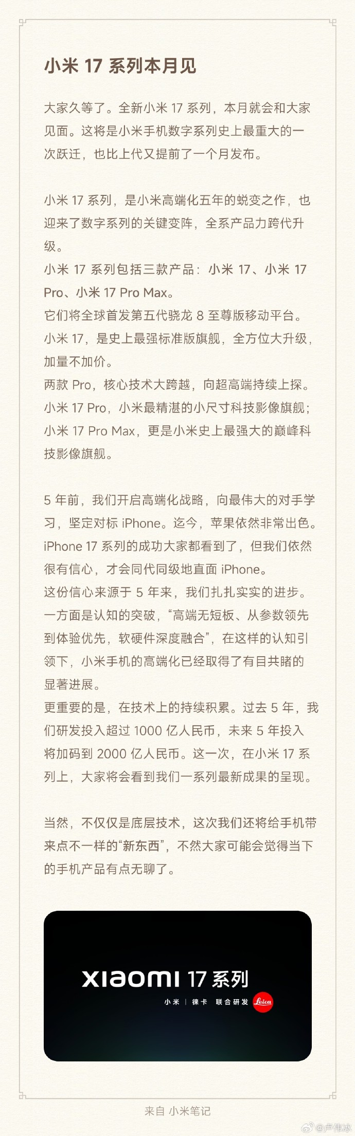 此前,9月15日,小米集团合伙人、总裁卢伟冰在社媒上发文表示,“5年前,我们开启高端化战略,向最伟大的对手学习,坚定对标iPhone。迄今,苹果依然非常出色。iPhone 17系列的成功大家都看到了,但我们依然很有信心,才会同代同级地直面iPhone。”