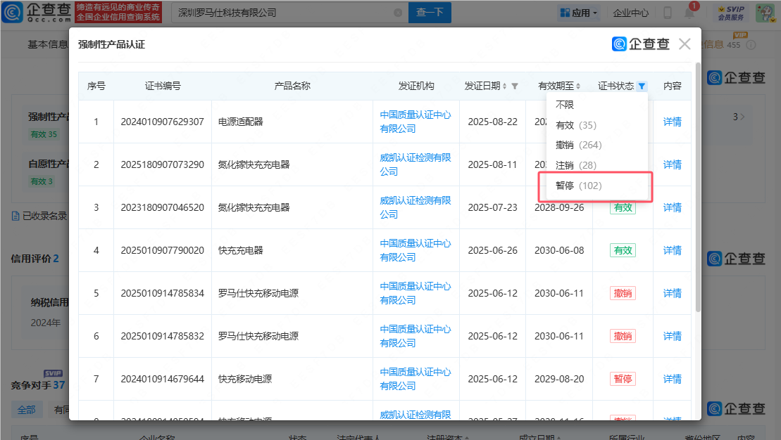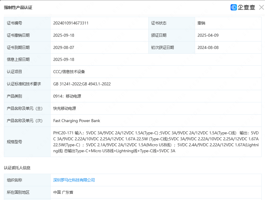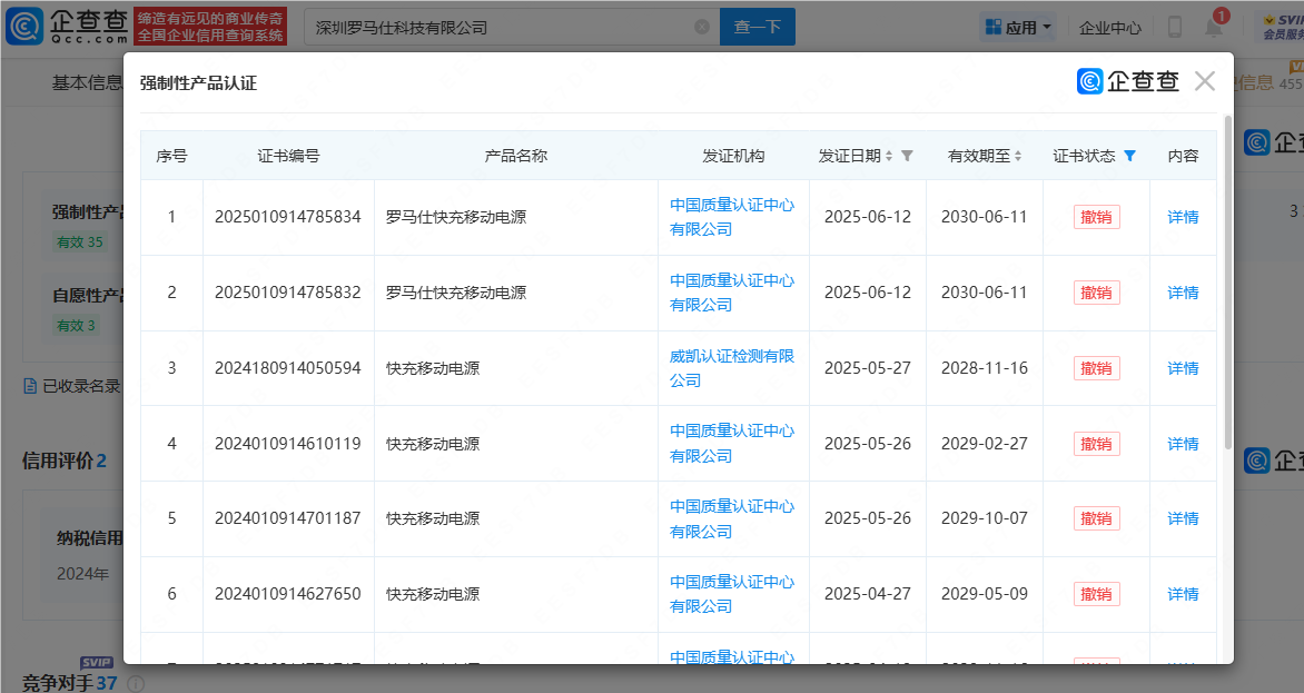 企查查APP显示,近日,深圳罗马仕科技有限公司多个快充移动电源强制性产品认证证书(3C证书)状态变更为“撤销”。此前,罗马仕深陷安全问题风波后,名下的多个快充移动电源3C证书状态变更为“暂停”。目前,罗马仕仍有多份3C证书处于暂停状态,尚未恢复。