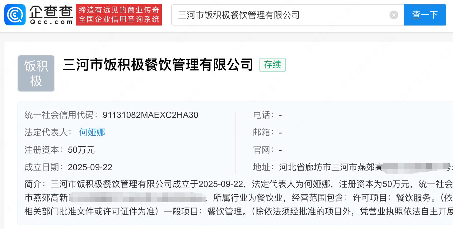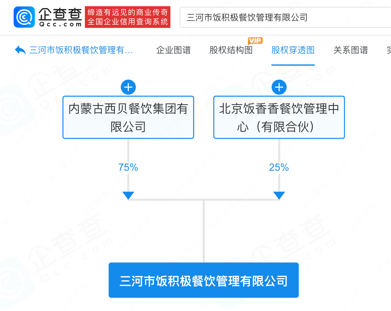 企查查APP显示,近日,三河市饭积极餐饮管理有限公司成立,注册资本50万,法定代表人何娅娜,内蒙古西贝餐饮集团有限公司、北京饭香香餐饮管理中心(有限合伙)分别持股75%、25%,经营范围包含餐饮服务等。