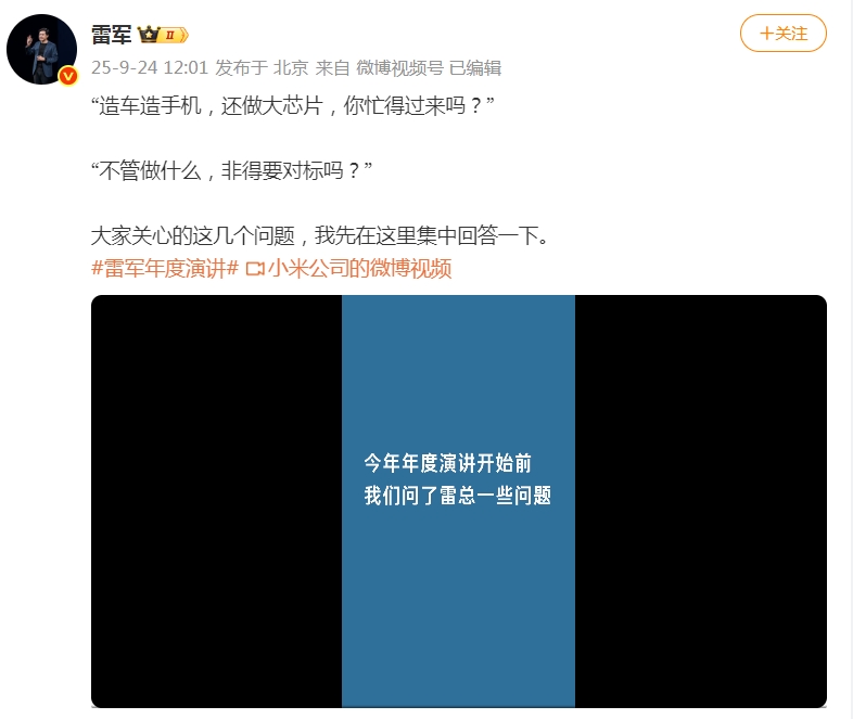 24日中午,雷军发布一段视频,就年度演讲提前回答了一些大家关心的问题。