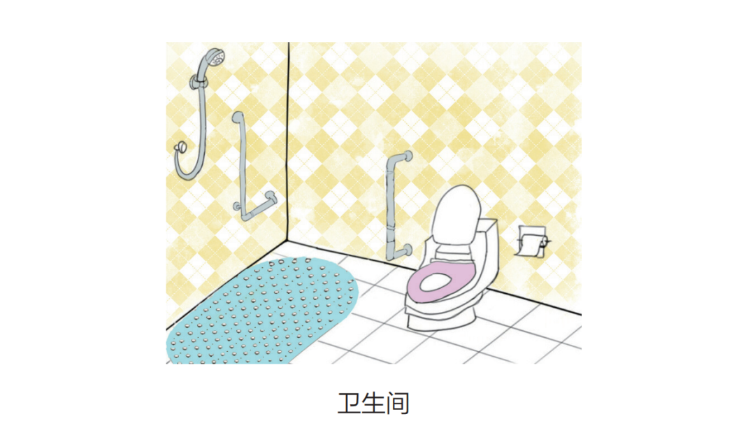 厨房卫生间:是最易发生跌倒的地方,卫生间有条件的建议设置扶手,放置防滑垫。