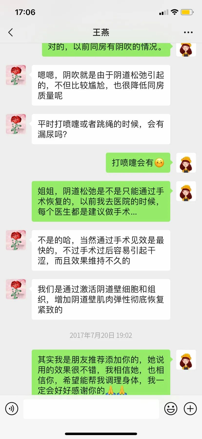 王燕了解我的情况后,给我推荐了一款很多已婚妇女而且多半是生过孩子的女性都从她那里拿的,并使用后反馈效果特别好的私密护理产品。