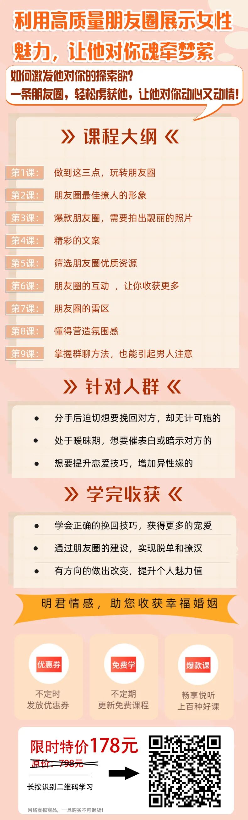 那一段时间,我让萱萱除了朋友圈,其余时间都不要联系男友,就算男友找自己聊,也不要说太多。于是,两人就这样在朋友圈,一来二去的互动,正式和好了。对比起直接把内容发到聊天框,或直接把话说给对方听,通过朋友圈把想要说的话隐晦的表达出来,更容易让人从心理上接受。简单来说就是,如果喜欢过一个人身上的某种特质,再次重新显示同样特质的时候,被吸引过的人还是会被吸引。除此之外,朋友圈不仅是挽回的重要窗口,也是不少女性朋友撩汉、获得男神青睐的重要捷径。其中,朋友圈的建设核心要点之一,就是根据双方的共同价值观、互相吸引点,以及共同区域作为素材要点。我们拥有6年多婚恋情感经验的导师特此制定了《利用高质量朋友圈展示女性魅力,让他对你魂牵梦萦》这一套课程,通过7节课程内容,手把手教你搭建高质量的朋友圈,在挽回、吸引他的同时,打造更高价值的自己。