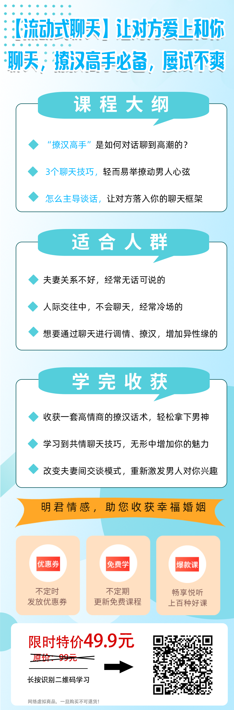 那么,具体怎么把这种“流动式”聊天,应用到实际生活不同语境当中?我们将在《【流动式聊天】让对方爱上和你聊天,撩汉高手必备,屡试不爽》一套课程中,从认知+方法+实操全套系列,为你破解聊天难题,并教会你巧用3个聊天技巧,打开男人的吸引力开关,让他情不自禁爱上你。
