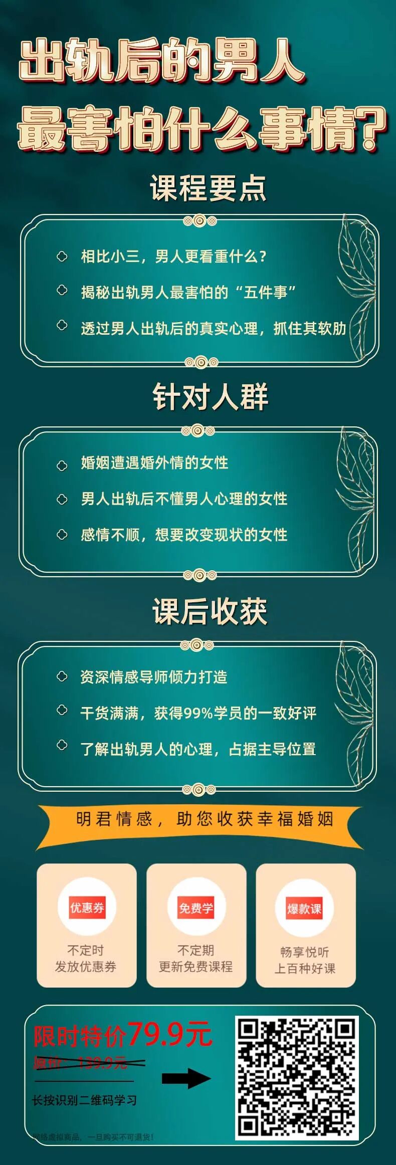 我们将在《出轨后的男人最害怕什么事情?》这一套课程中,为你揭秘出轨男人最害怕的5件事,让原配妻子抓住男人的死穴,制胜反击,同时为你详细分析,男人出轨后心理,为维系婚姻做进一步打算。