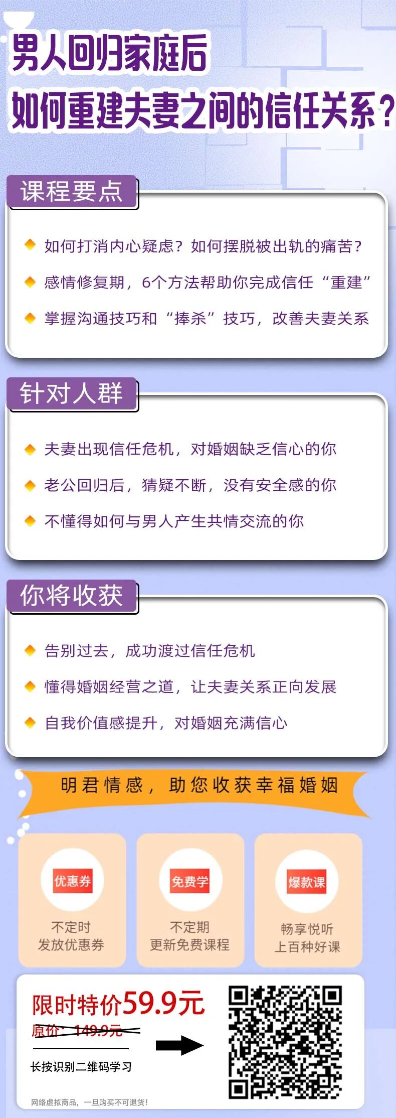 我们将会在《男人回归家庭后,如何重建夫妻之间的信任关系?》这套课程中,教你6个实操性的方法和技巧,帮助你成功渡过婚姻中的信任危机,同时掌握婚姻经营技巧,读懂男人心理,让你的婚姻生活更幸福美满。