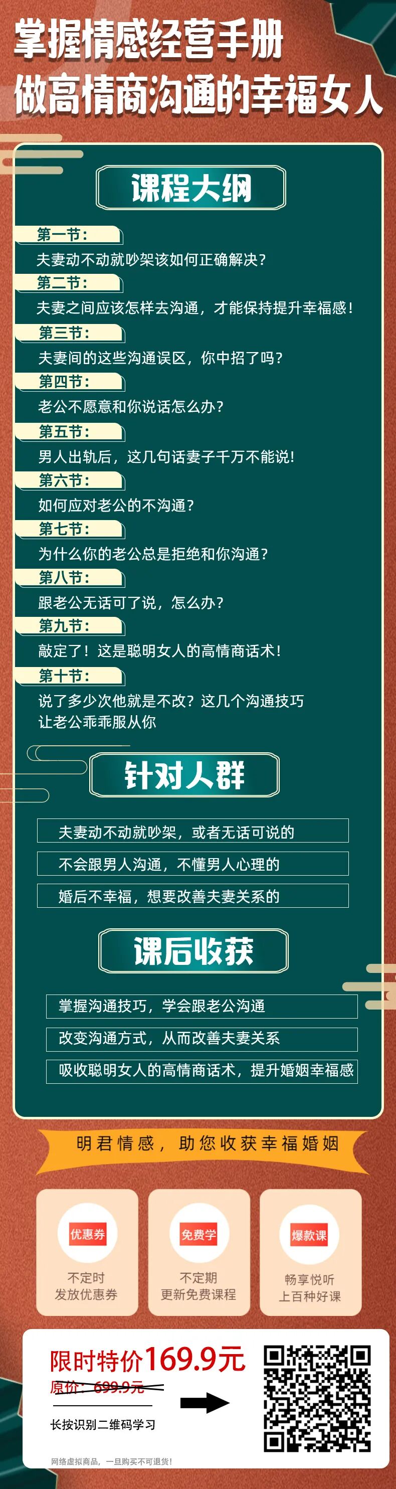 最后争吵越演越烈,气急败坏的丈夫摔门而去,徒留我一人和两个哇哇大哭的宝宝在房间。那天快到凌晨一点的时候,丈夫才从外面回来,之后到现在十多天了,我们也没说过一句话。这个月已经第4次,发生这样的争吵了,而我们坐在一起无话可说,也已经不知是这个月的第几次了。我真的快被压抑得喘不过气了,我也想要和丈夫好好沟通,解决问题,可每次都闹的不欢而散,你说我的婚姻还有没有得救?其实我非常能理解陈太太的感受,不仅要打理一大推的生活琐事,而且还得不到丈夫的半句好话和体谅,是人都会崩溃。但丈夫不愿沟通,走到无话可说这一步,却也是由自己亲手造成:在沟通时,不会好好话说。很多时候,我们明明是想要对方的一句关心,或一句回应,可情绪一上来,自己都难控制,导致一开口就没一句好话,就像案例中的陈太太,一着急所说出口的话,至今都令她后悔不已。还有些妻子可能性格使然,心直口快惯了,又或许是刀子嘴豆腐心,一张口就变得口无遮拦了,可不管是什么理由,不会说话总是伤人于无形。当然好好说话,并不意味着你要一味的忍让男人,而是通过高情商沟通来化解和男人之间的误会和矛盾,同时又不会让对方感觉到心烦。那么,面对婚姻中男人的不沟通、不说话,你该如何打破僵局?作为妻子的你,如何才能做到与丈夫好好说话?又如何成为高情商沟通的女人,让男人乖乖服从你?我们将在《掌握情感经营手册,做高情商沟通的幸福女人》这套专栏中,通过10节课程内容,带你走进男人的内心世界,同时帮你规避夫妻间的沟通误区,让你掌握一套高情商的沟通技巧,征服男人心,成功改善夫妻关系!
