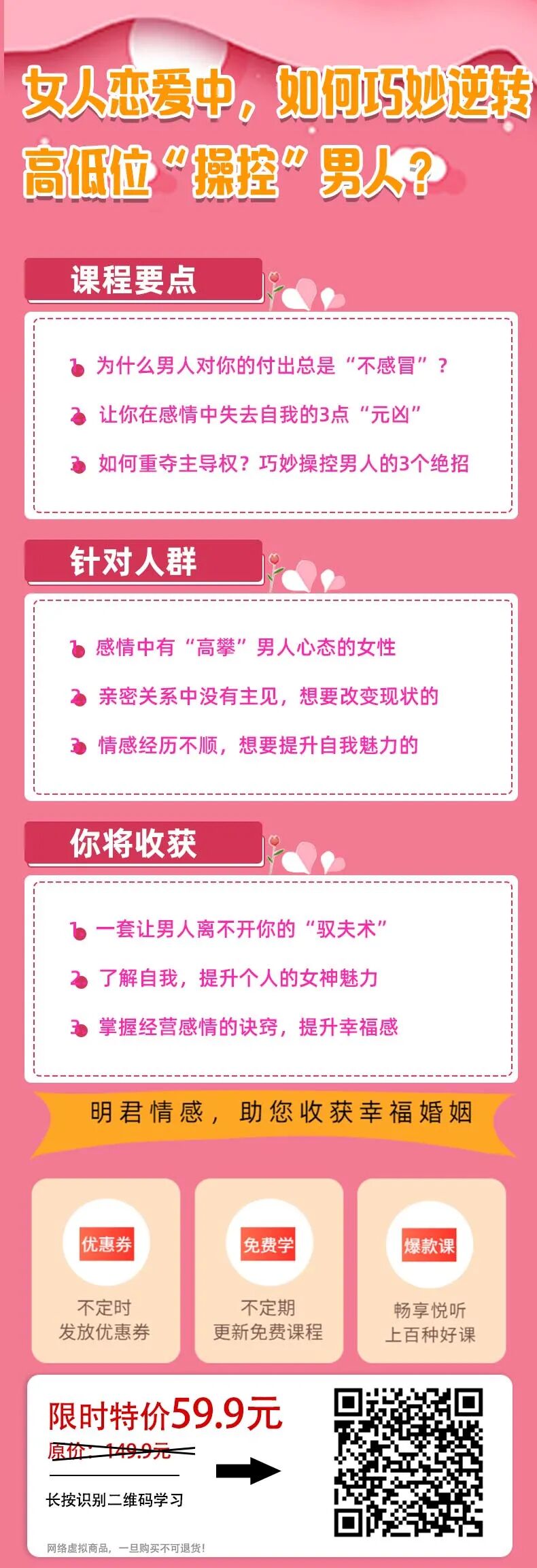 我们拥有多年情感经验的老师,特制定了《女人恋爱中,如何巧妙逆转高低位“操控”男人?》这套课程。通过实证分析以及具体性的实操方案,帮助女性挽回感情及提升自我魅力。你可以把它当做是提升自我认知的一课,也可用于恋爱中逆转“高低位”的参考指南。