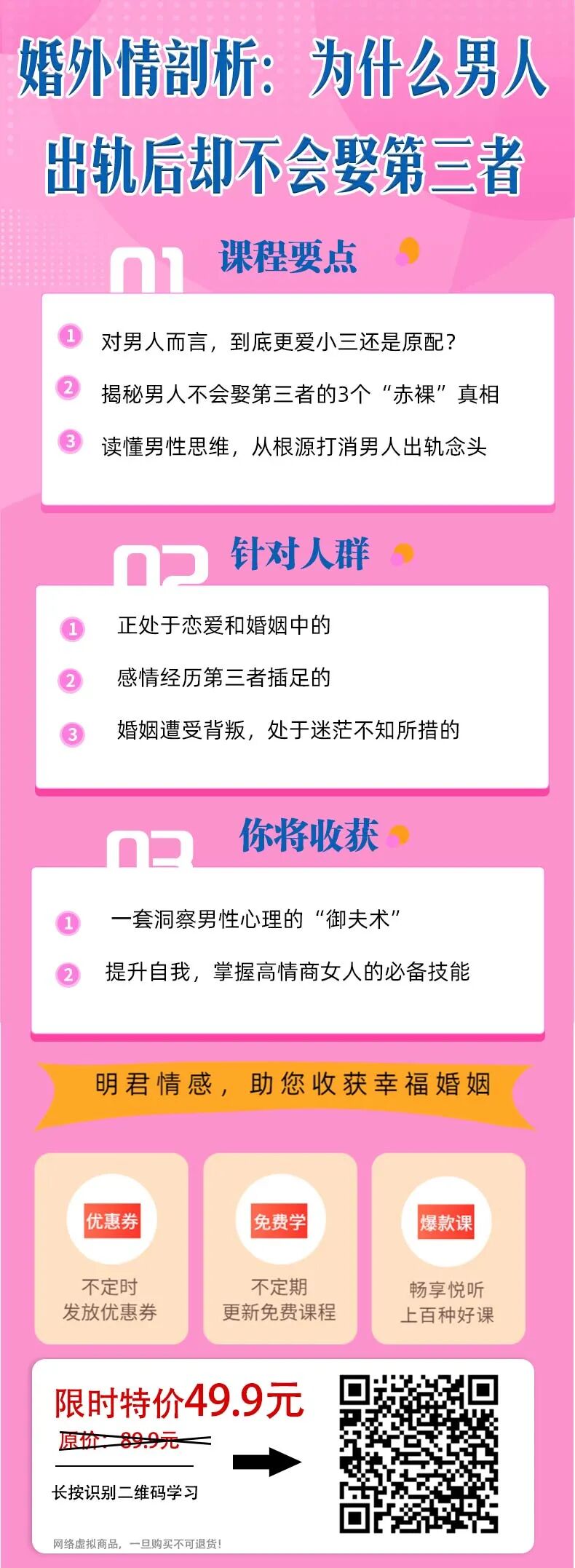 做情感咨询这么多年,求助者大多是来挽回婚姻的,可不久前,却有一位女性求助者,让我们帮她和丈夫离婚。这位女性朋友和丈夫结婚四年了,恋爱期间就和丈夫一直在外打拼,现如今夫妻两人也拥有了一家小有成就的电商公司。一年前,她有了宝宝后,便退居幕后,公司交由丈夫全权打理。可就在一个月前,她发现丈夫出轨了,第三者是丈夫的秘书,面对她的质问,丈夫没有逃避,反而扬言“自己遇到了真爱,小三对他不求任何回报”。看着丈夫坚定的眼神,她心灰意冷的提出了离婚,可让她没想到的是,丈夫不仅不同意离婚,还大发雷霆警告她以后不准再提离婚二字。之后一段时间,哭也哭过,闹也闹过,可无论她怎么做,丈夫就是不愿和她离婚。她说,明明自己提离婚是成全了他和第三者,可为什么丈夫反而不同意?丈夫究竟是怎么想的?其实,不仅是案例中出轨的丈夫不愿意离婚,这件事就算是放在生活中任何一位男人身上,他们也基本都不会因为自己出轨,而选择与原配离婚,去娶第三者的。虽然男人们很享受第三者的温柔和关怀,但是他们对第三者的感情分量,往往不足以达到让他可以舍弃一切。明明是男人自己扬言说“真爱”出轨的啊,可为什么他不干脆离婚娶小三呢?男人又是如何看待第三者的?我们将在《婚外情剖析:为什么男人出轨后却不会娶第三者?》这套课程中,为你揭秘男人出轨后不愿离婚娶第三者的3点“心机”真相,帮助你一目了然洞察男人真实内心,从而做出正确的应对方法及决策。此课程由5位资深情感导师倾力打造,内容涵盖案例分析及知识点技巧,你不仅可以把它当成是婚前了解学习男性思维重要的一课,也是婚后应对男人出轨的参考指南。